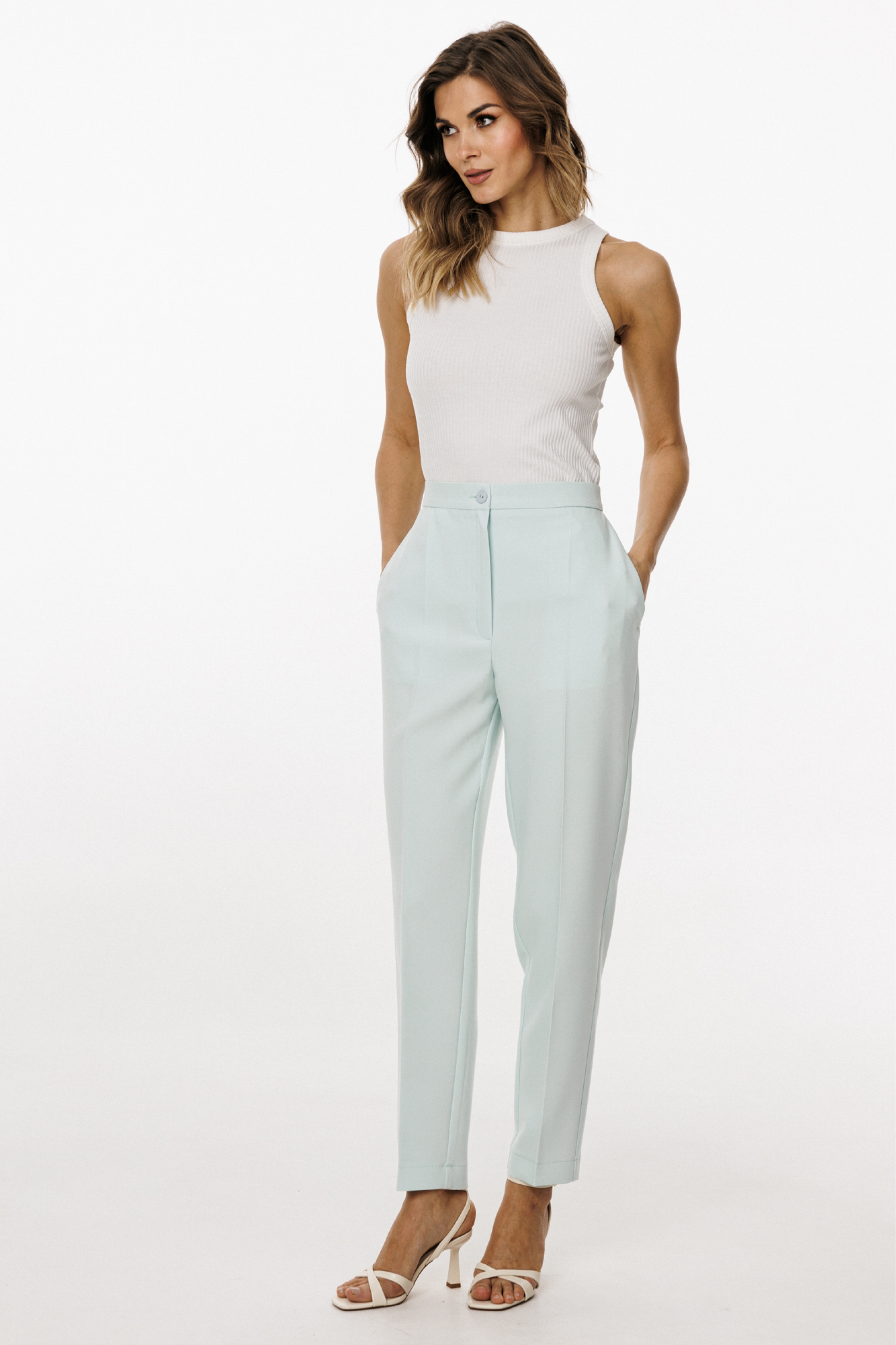Брюки выполнены из костюмной ткани. Брюки зауженные к низу, длиной 7/8, на притачном поясе. Спереди боковые карманы с наклонным входом и застежка на молнию.