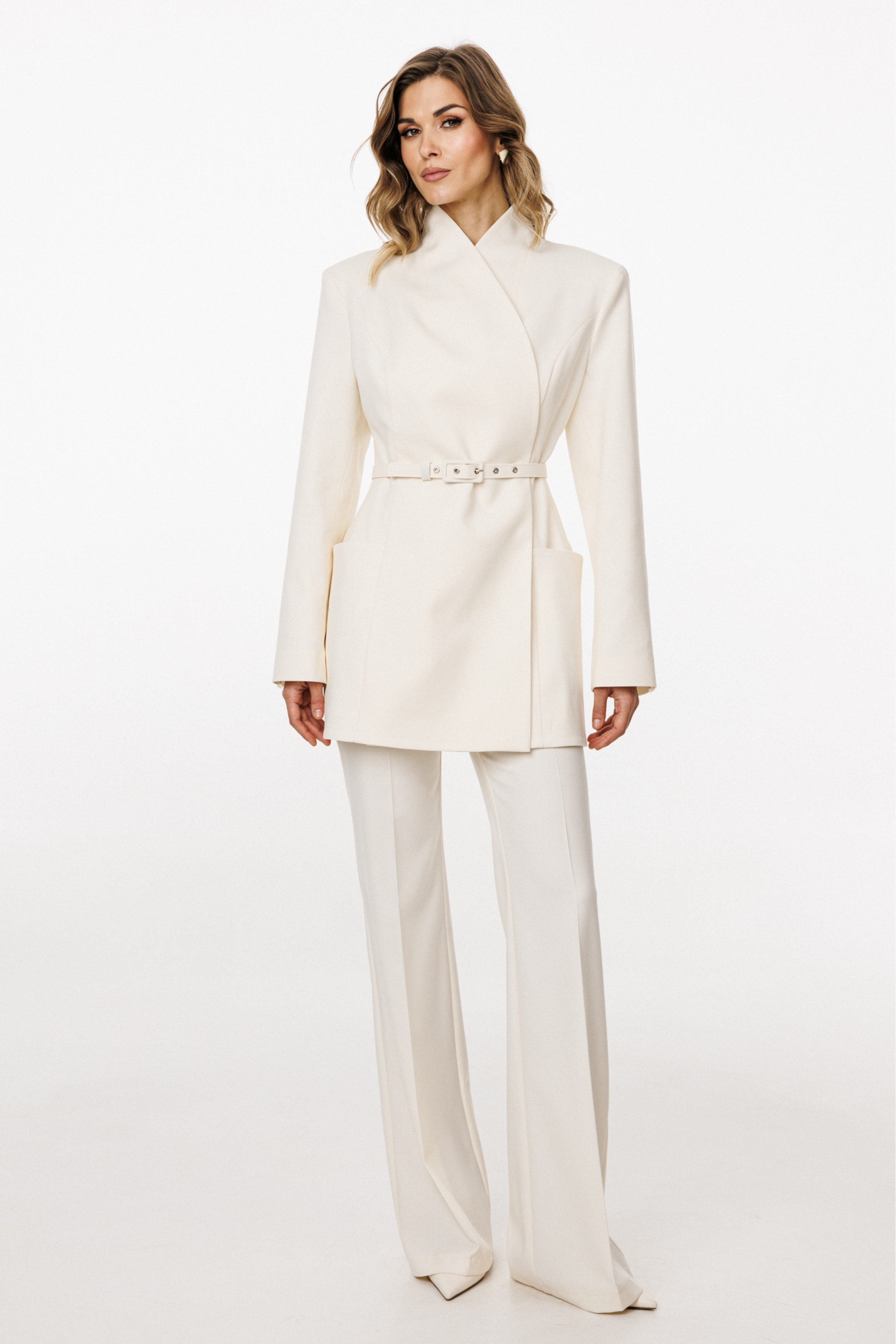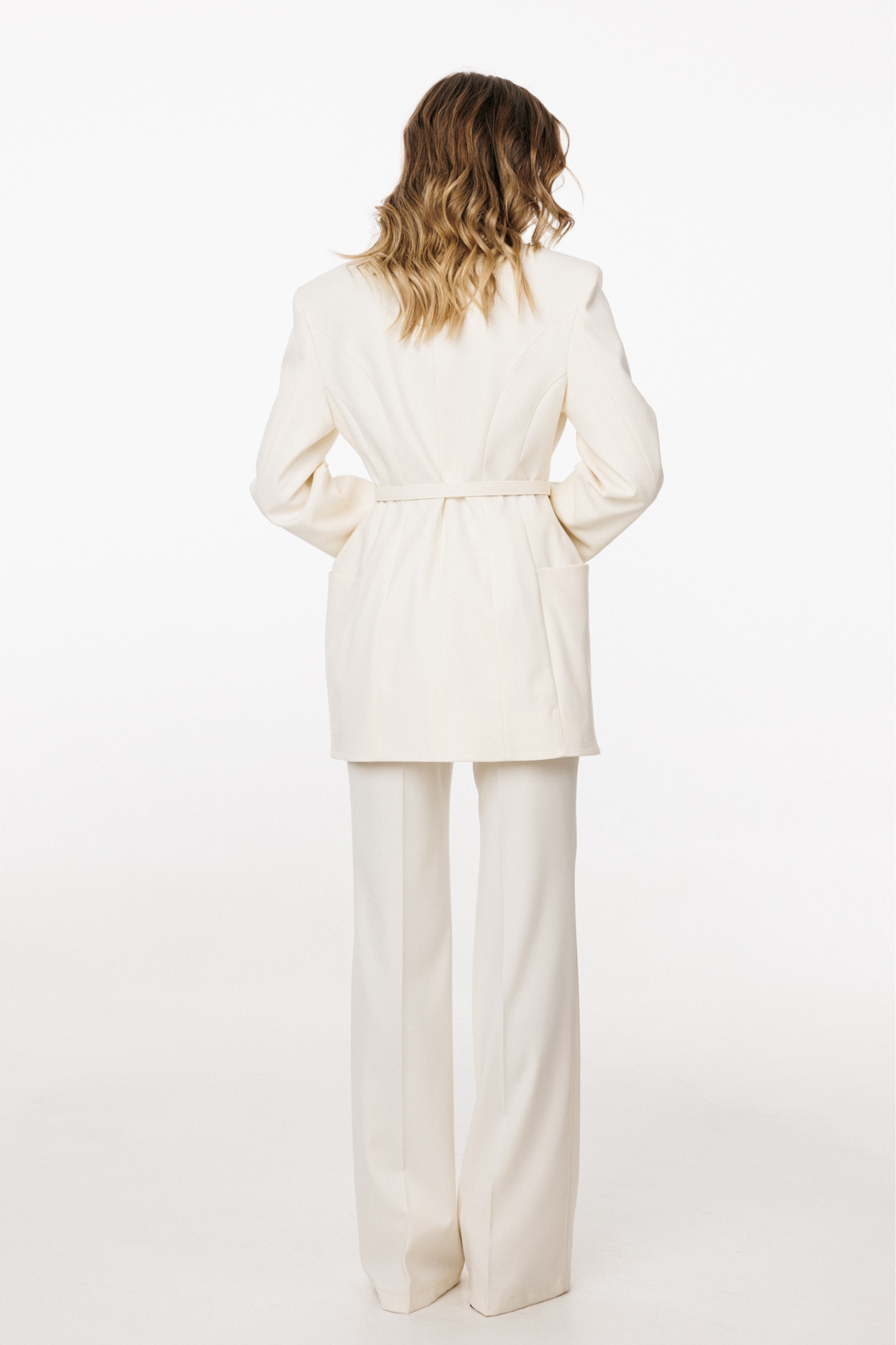 Брюки выполнены из костюмной ткани. Брюки покроя ""клеш"", на притачном поясе, длиной в пол. Спереди застежка на молнию с гульфиком, потайную пуговицу и два брючных крючка. Передние и задние части брюк заутюжены на кант.