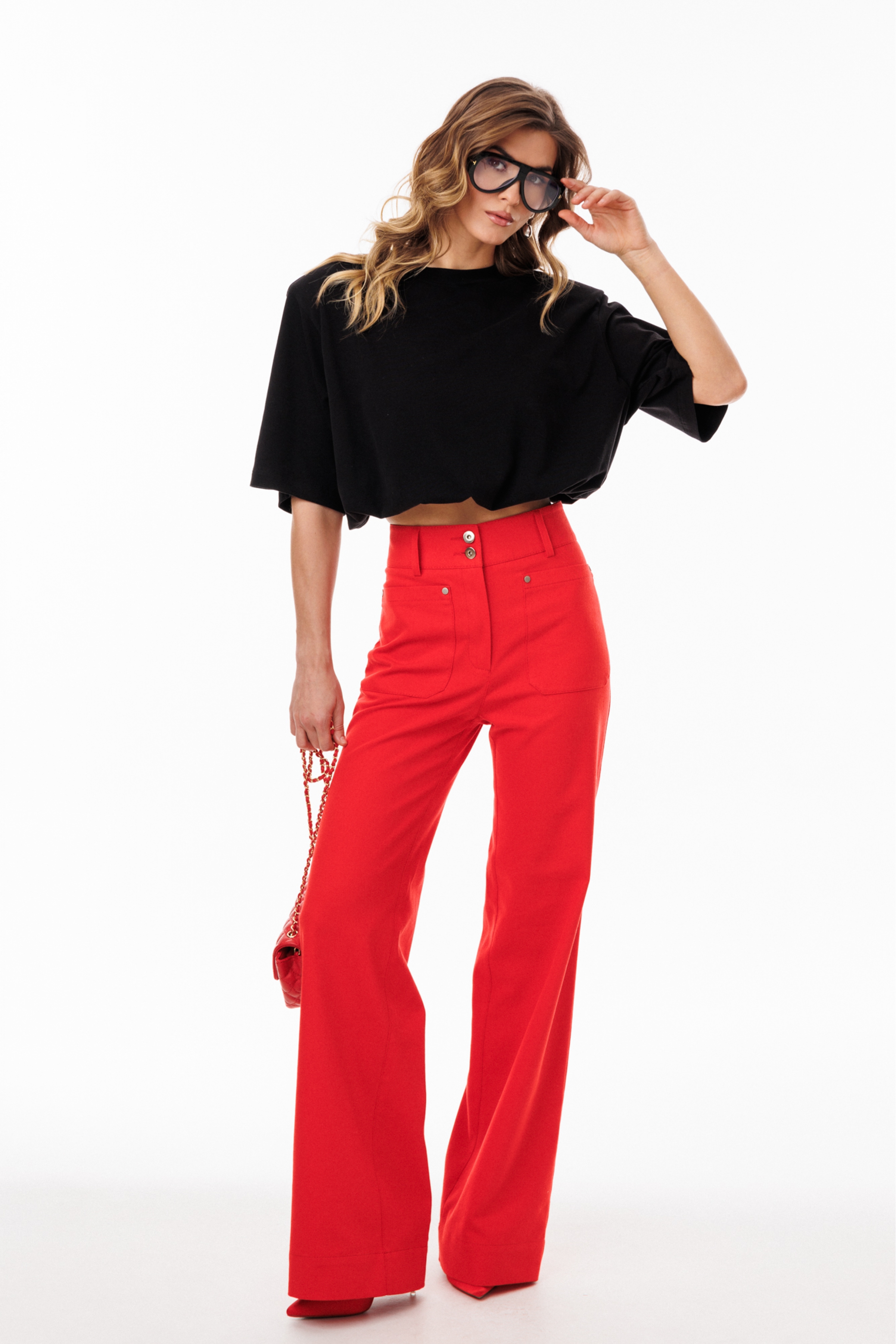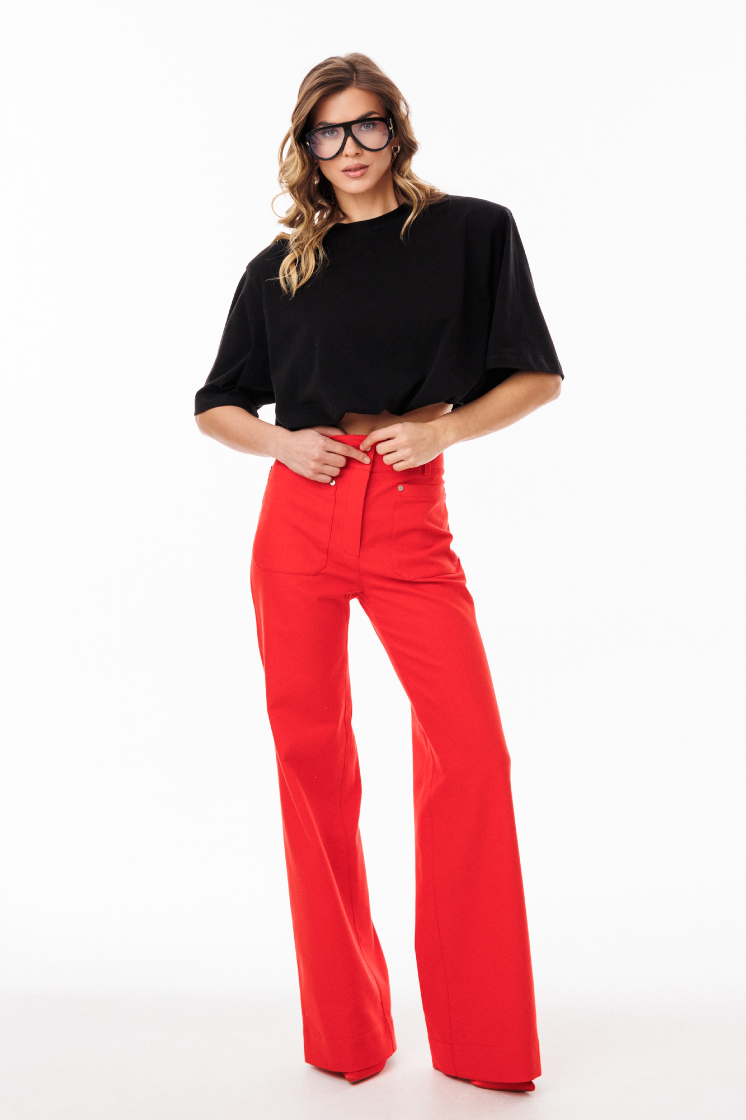 Брюки-клеш выполнены из джинса. Брюки на притачном поясе, длиной в пол. На передних частях обработаны накладные карманы и застежка на металлическую молнию с гульфиком. На задних частях обработаны талиевые вытачки. По поясу обработаны шлевки. Пояс застегивается на две металлические пробивные пуговицы. На накладных карманах хольнитены.