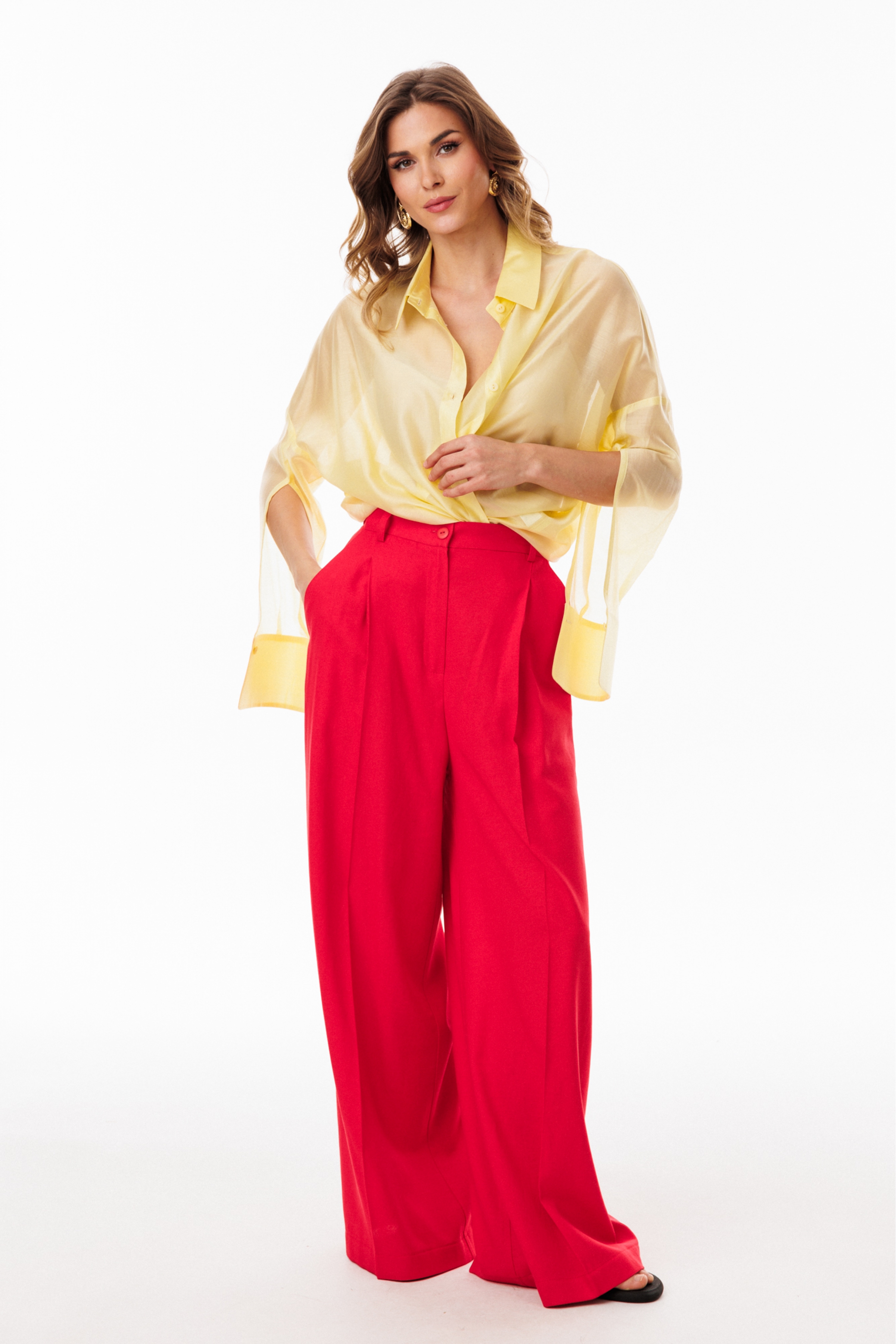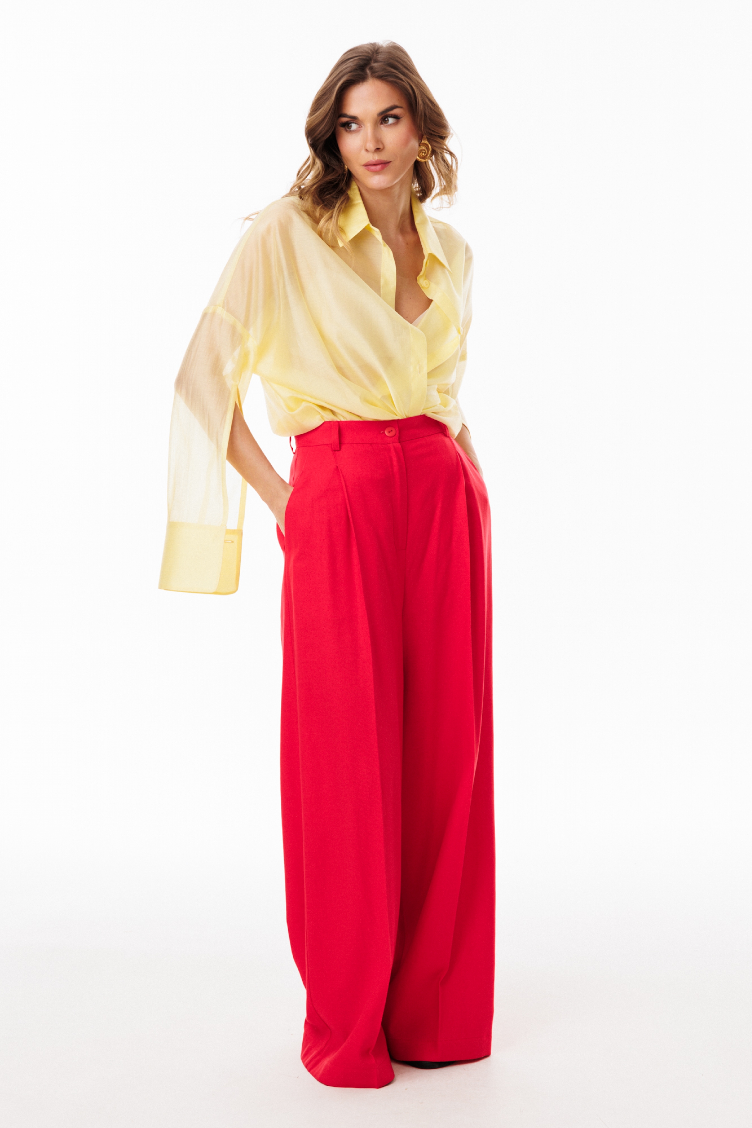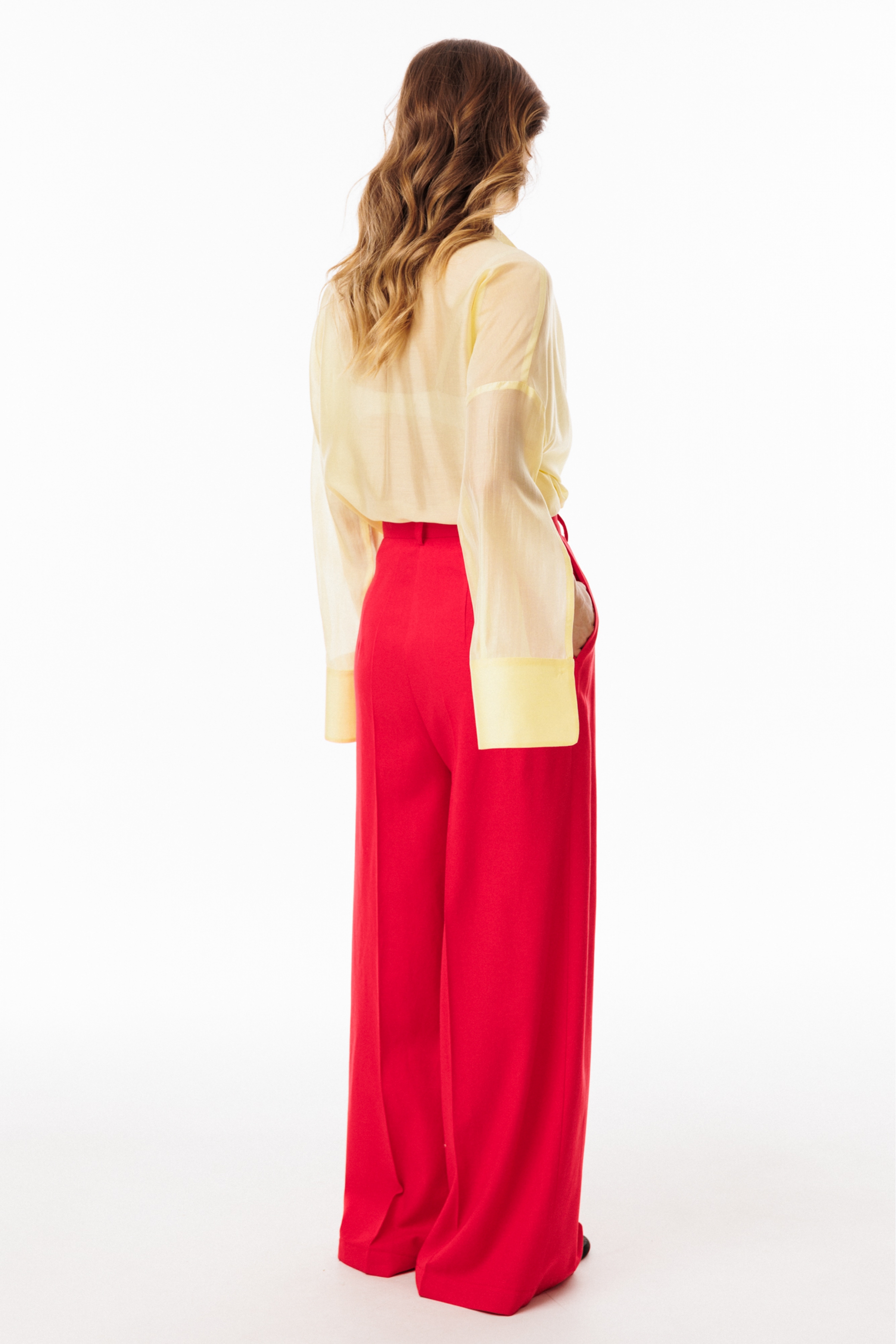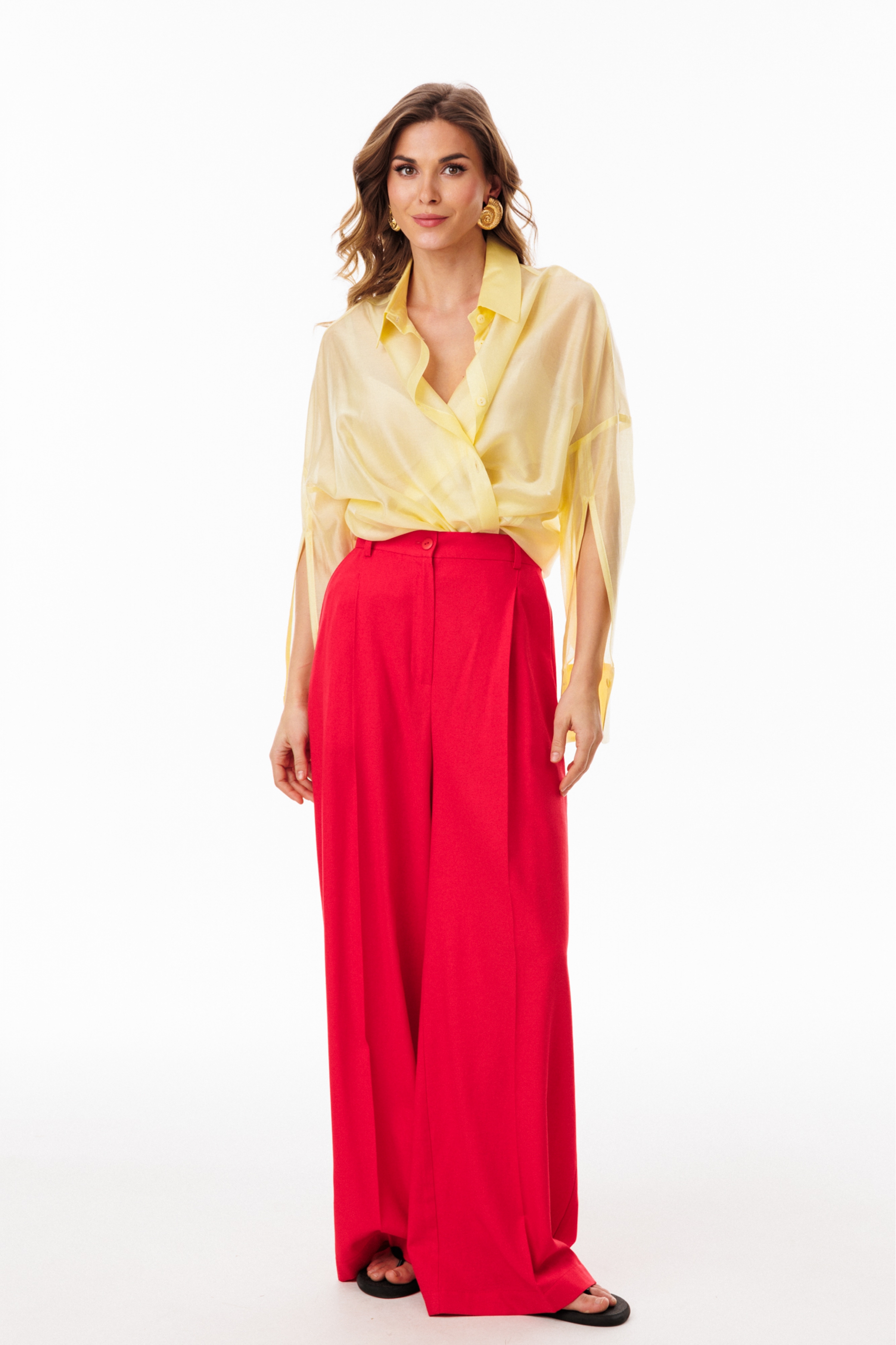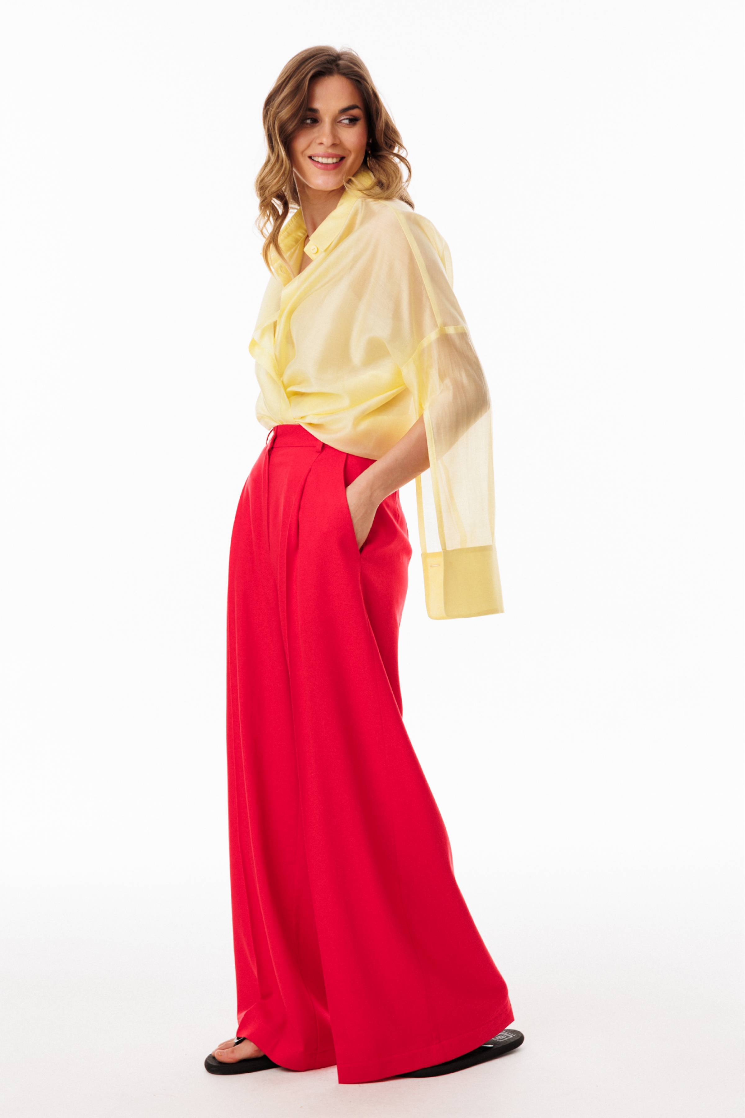 Брюки-палаццо выполнены из льна. Брюки на притачном поясе, длиной в пол, расширенные к низу. Спереди складки и боковые карманы с наклонным входом. Застежка спереди на молнию с гульфиком и пуговицу. На задних частях обработаны талиевые вытачки.