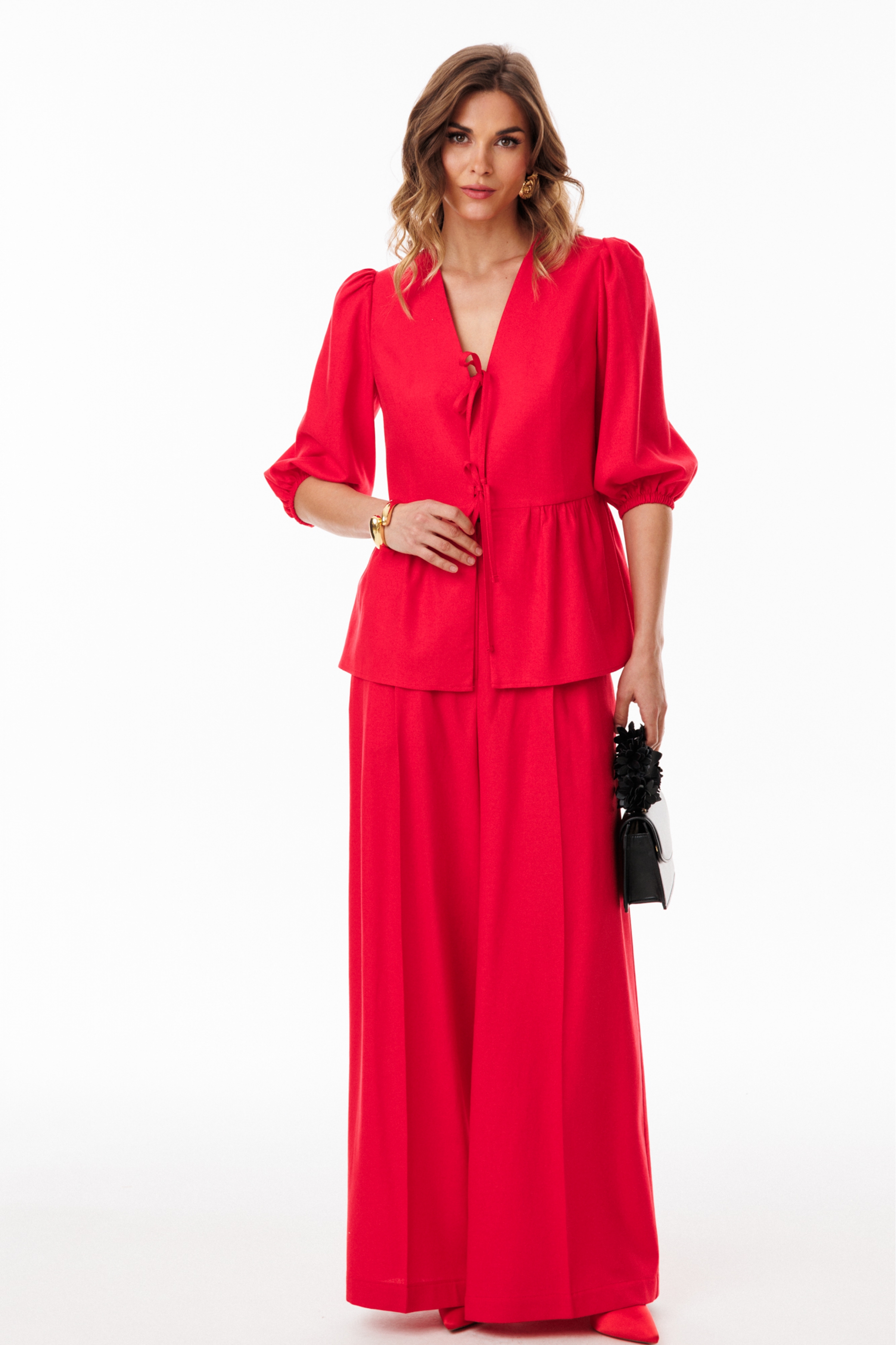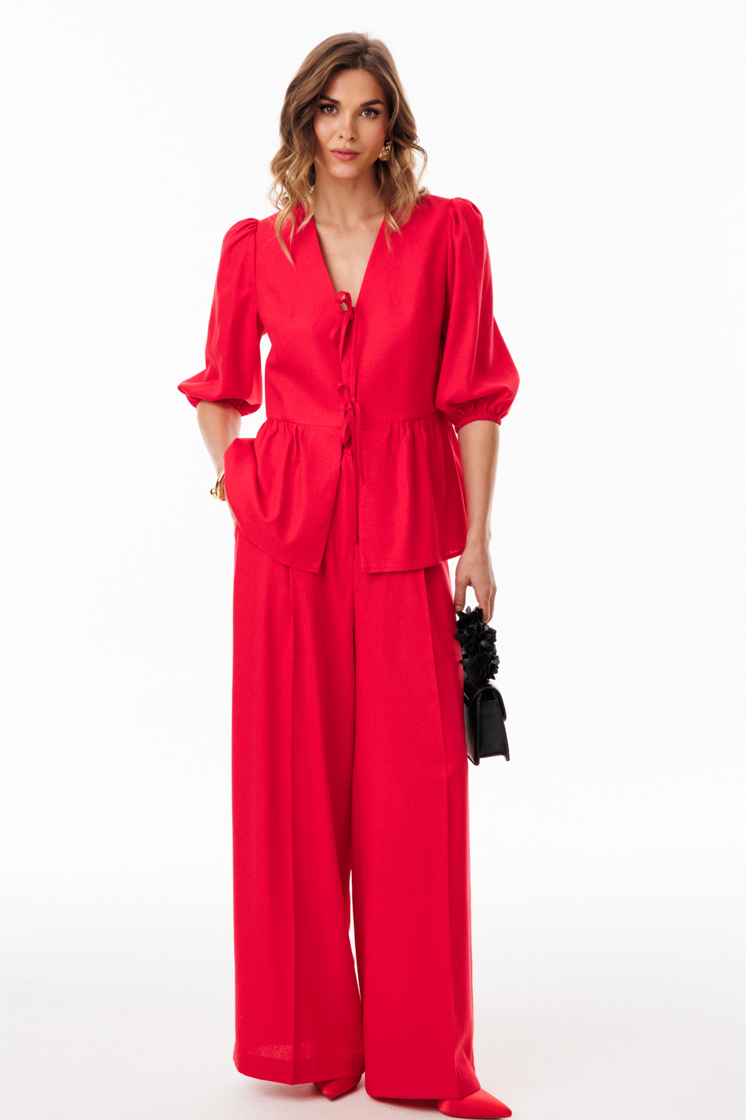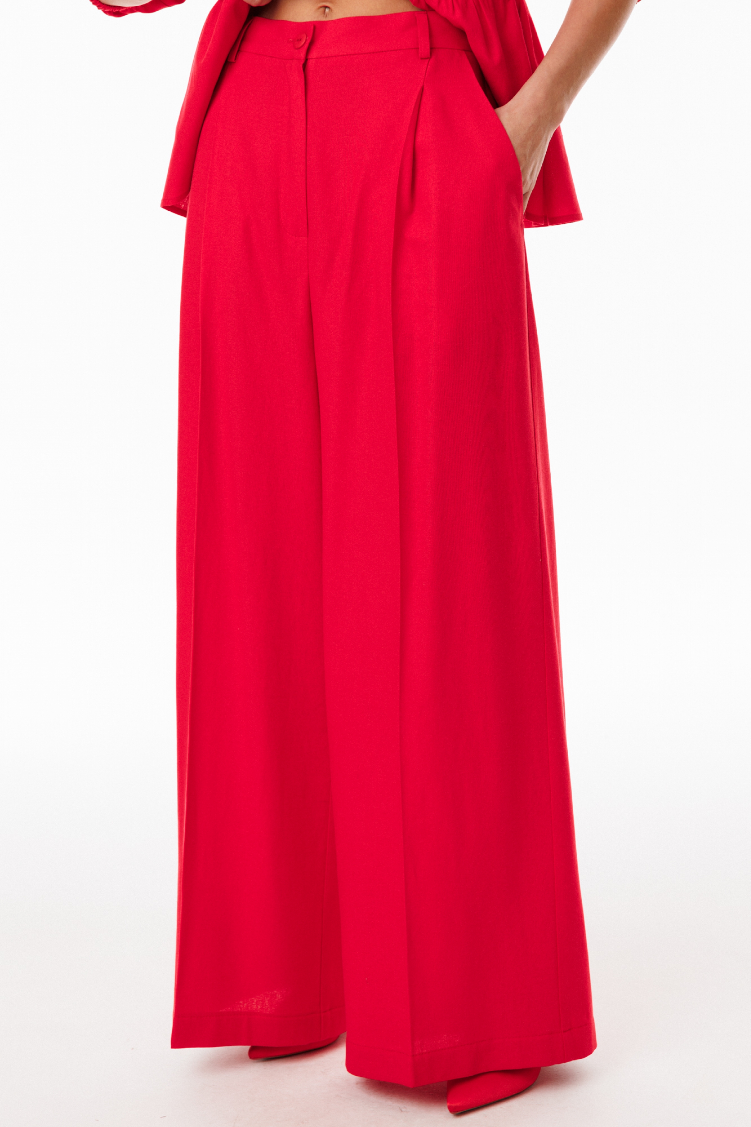 Брюки-палаццо выполнены из льна. Брюки на притачном поясе, длиной в пол, расширенные к низу. Спереди складки и боковые карманы с наклонным входом. Застежка спереди на молнию с гульфиком и пуговицу. На задних частях обработаны талиевые вытачки.