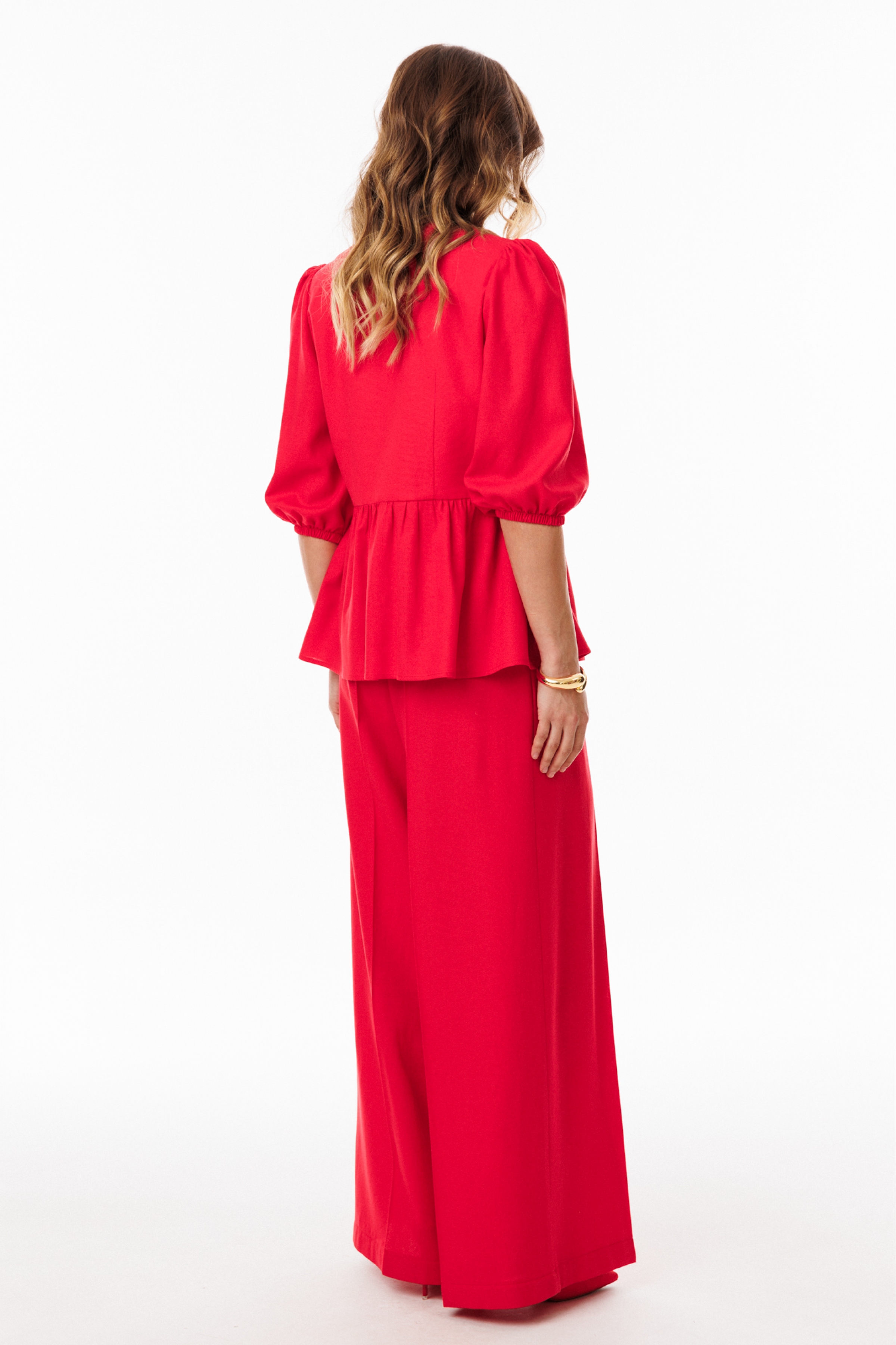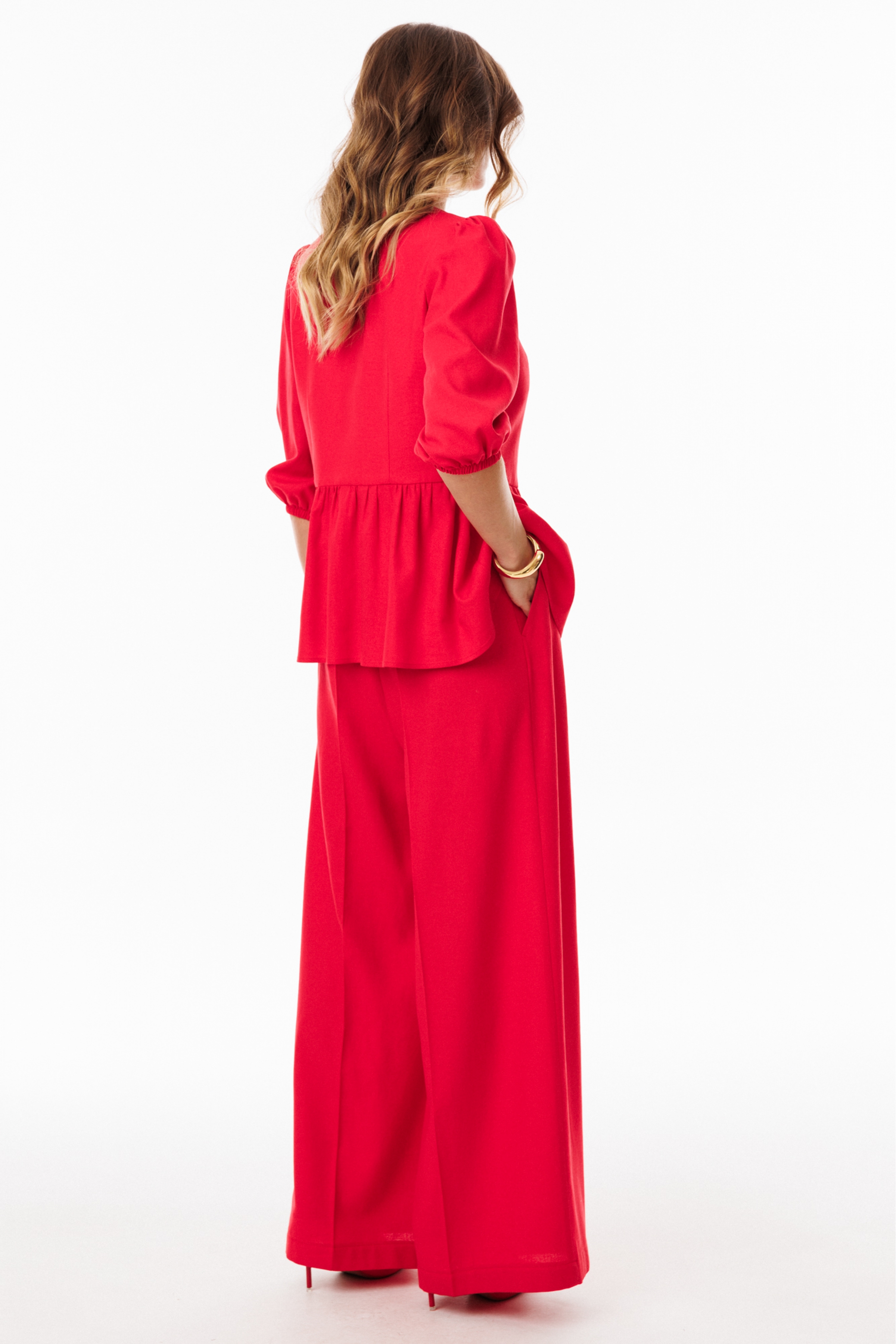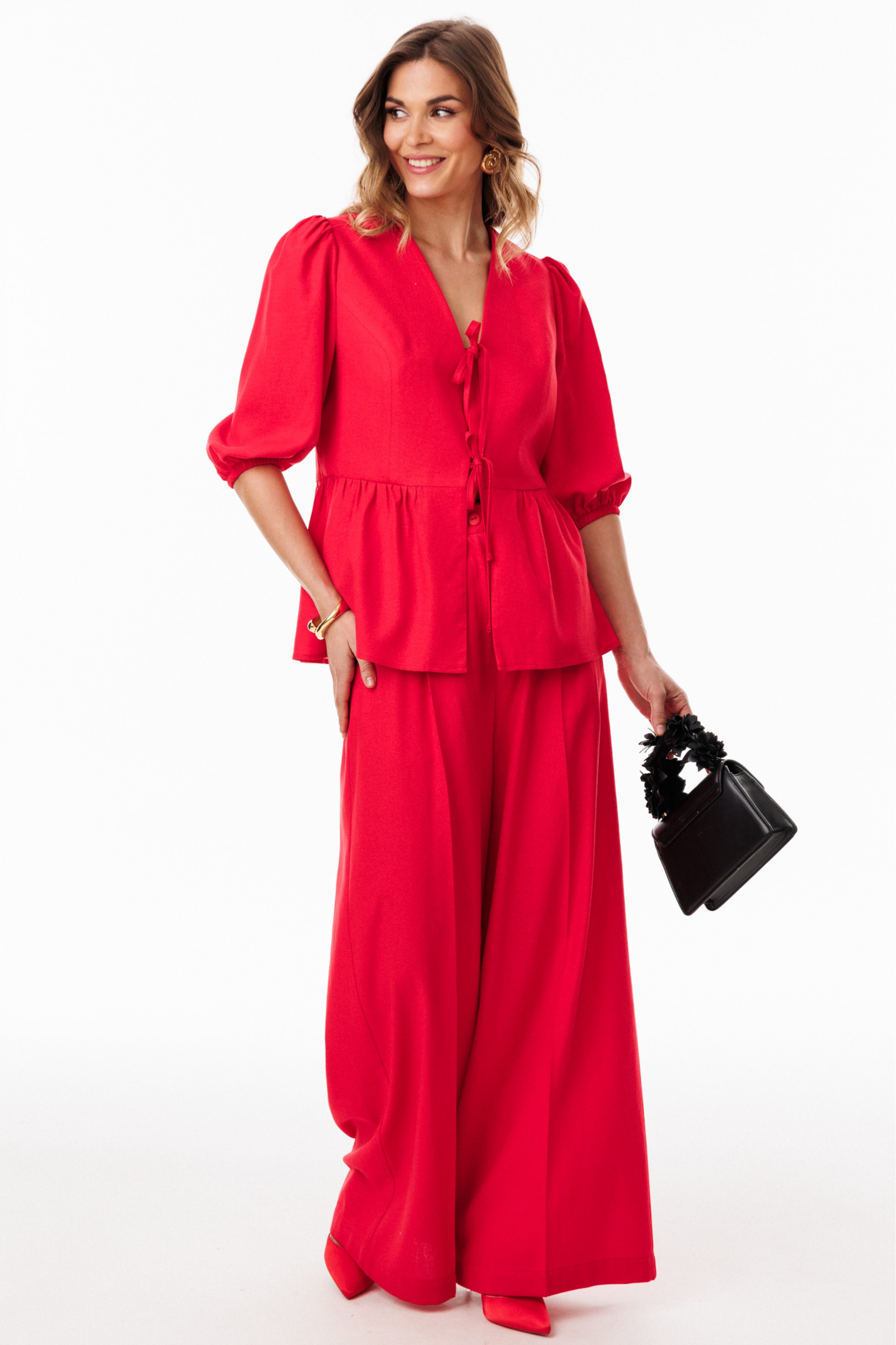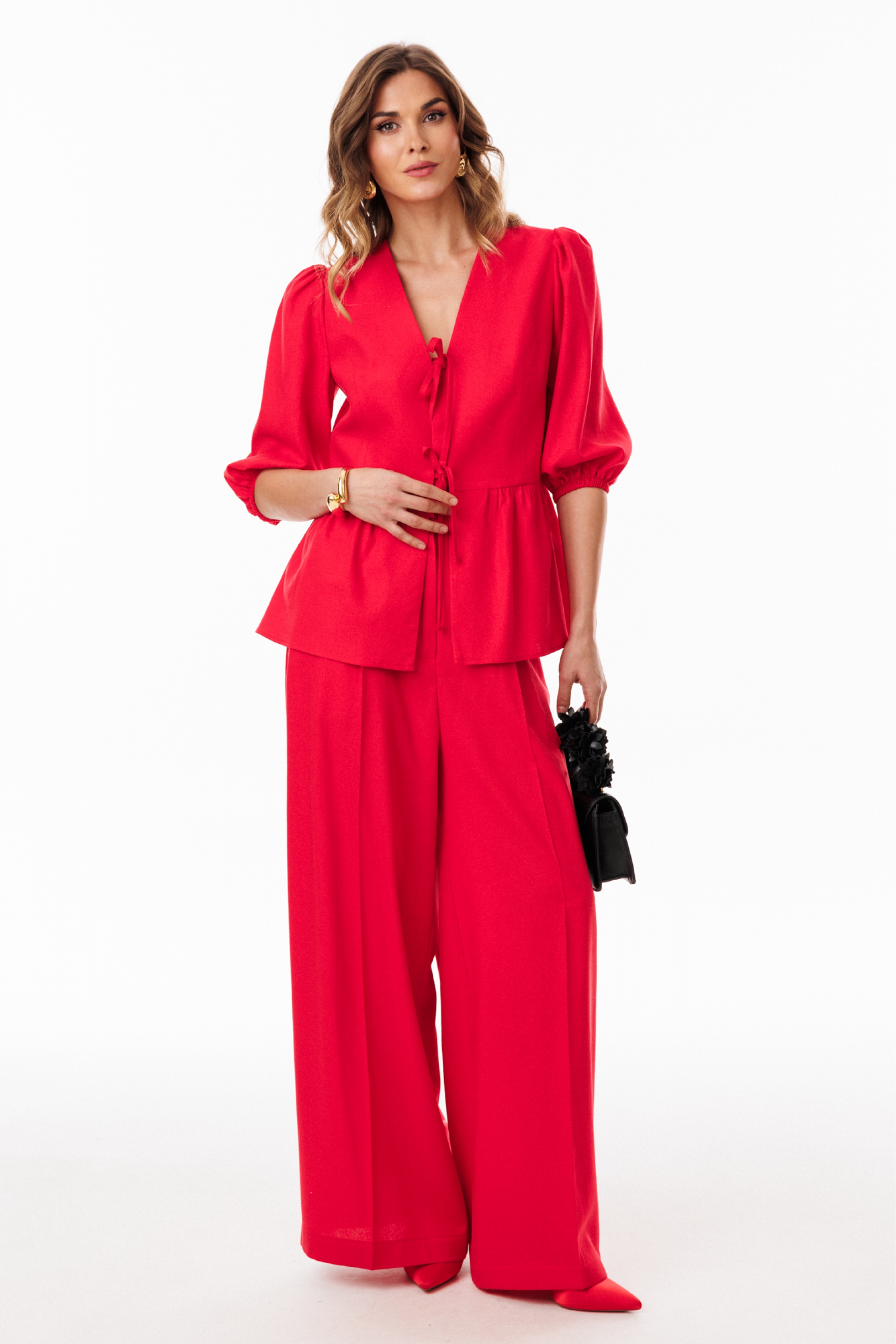 Брюки-палаццо выполнены из льна. Брюки на притачном поясе, длиной в пол, расширенные к низу. Спереди складки и боковые карманы с наклонным входом. Застежка спереди на молнию с гульфиком и пуговицу. На задних частях обработаны талиевые вытачки.