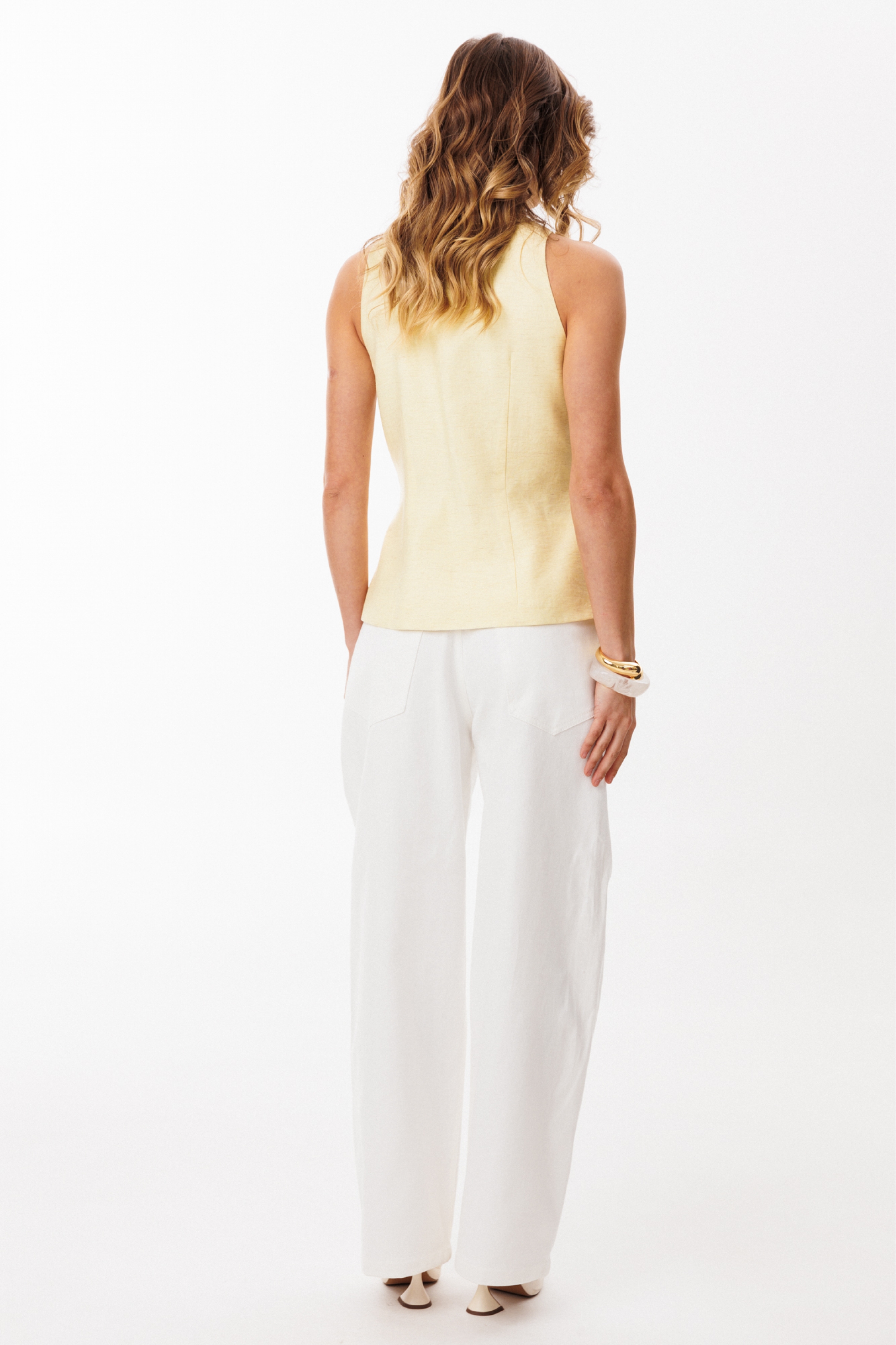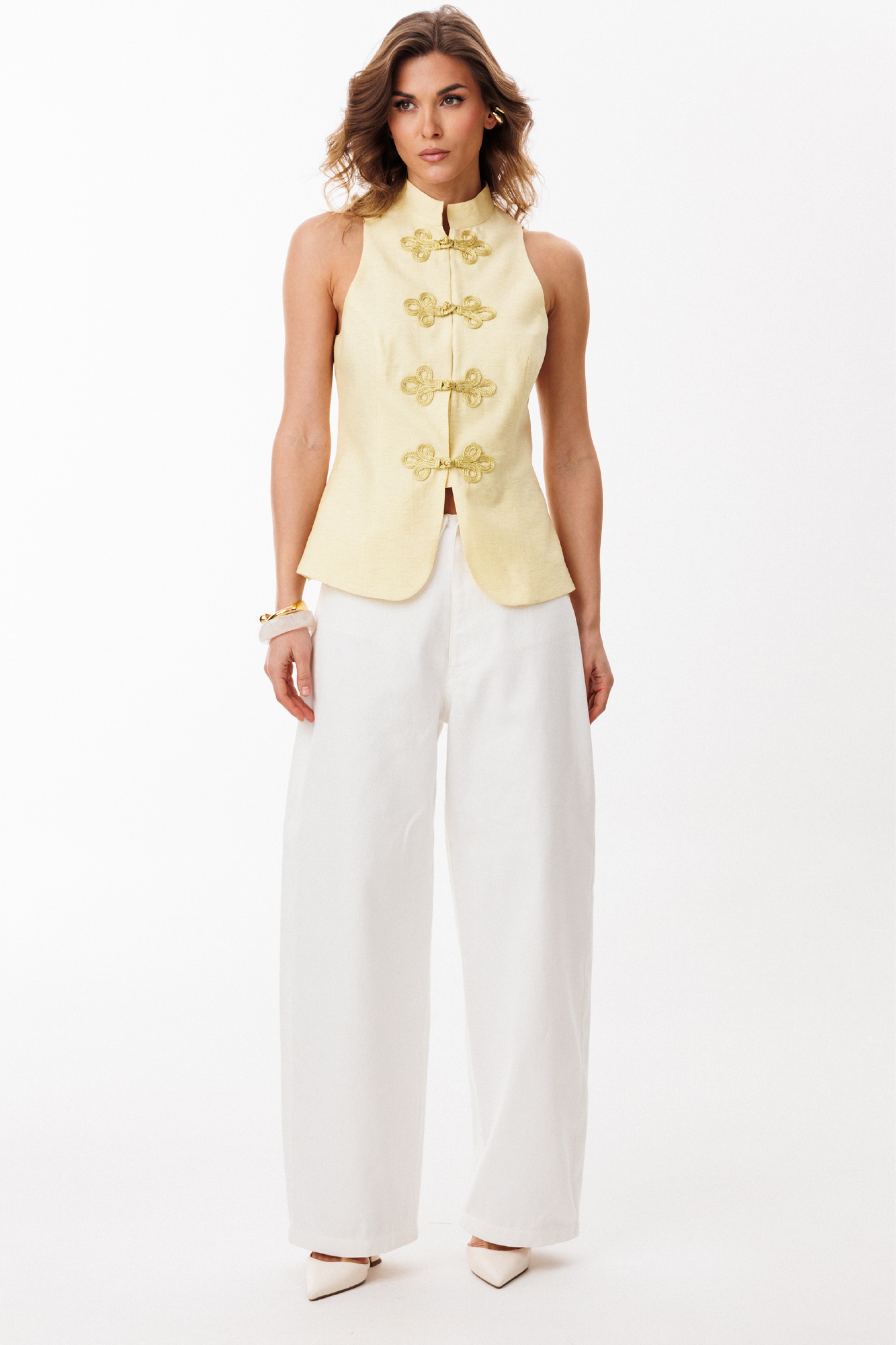 Брюки выполнены из джинса. Брюки прямого силуэта, на притачном поясе, длиной в пол. На передних частях обработаны фигурные боковые карманы и застёжка на металлическую молнию и пуговицу. На задних частях обработаны кокетки и накладные карманы. Пояс выполнен с декоративным отворотом на лицо. По поясу обработаны пять шлевок и декоративная петля.