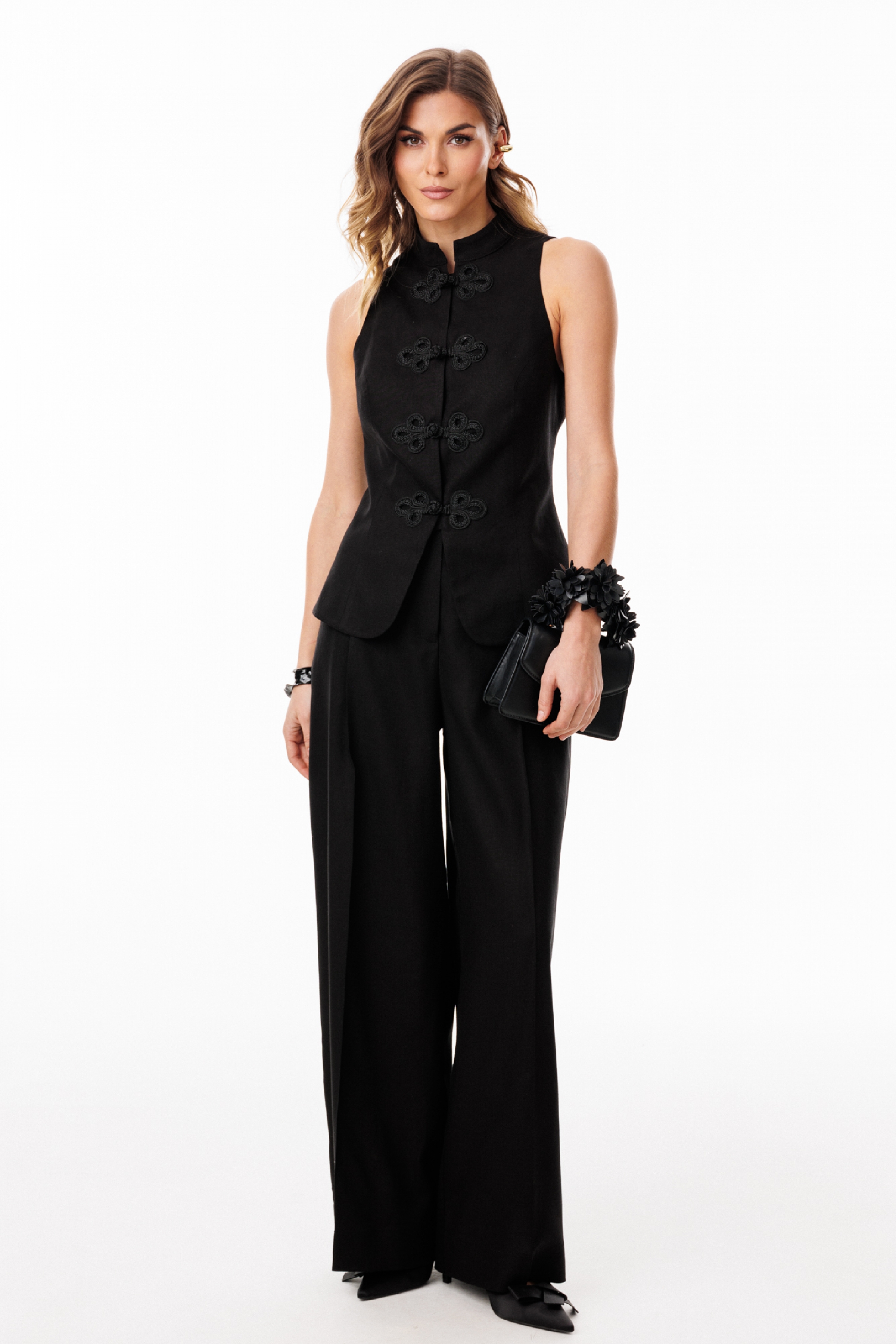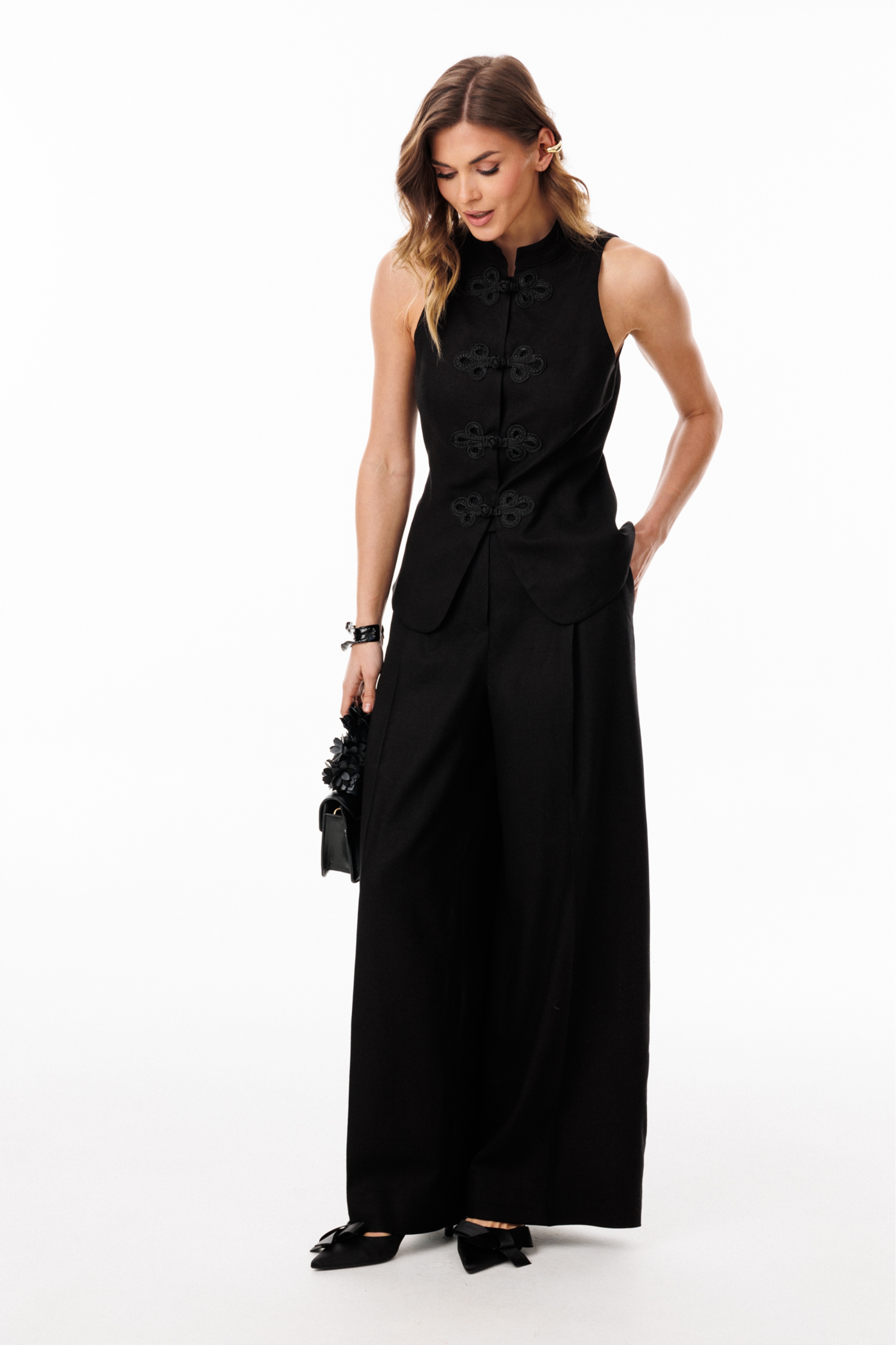 Брюки-палаццо выполнены из льна. Брюки на притачном поясе, длиной в пол, расширенные к низу. Спереди складки и боковые карманы с наклонным входом. Застежка спереди на молнию с гульфиком и пуговицу. На задних частях обработаны талиевые вытачки.
