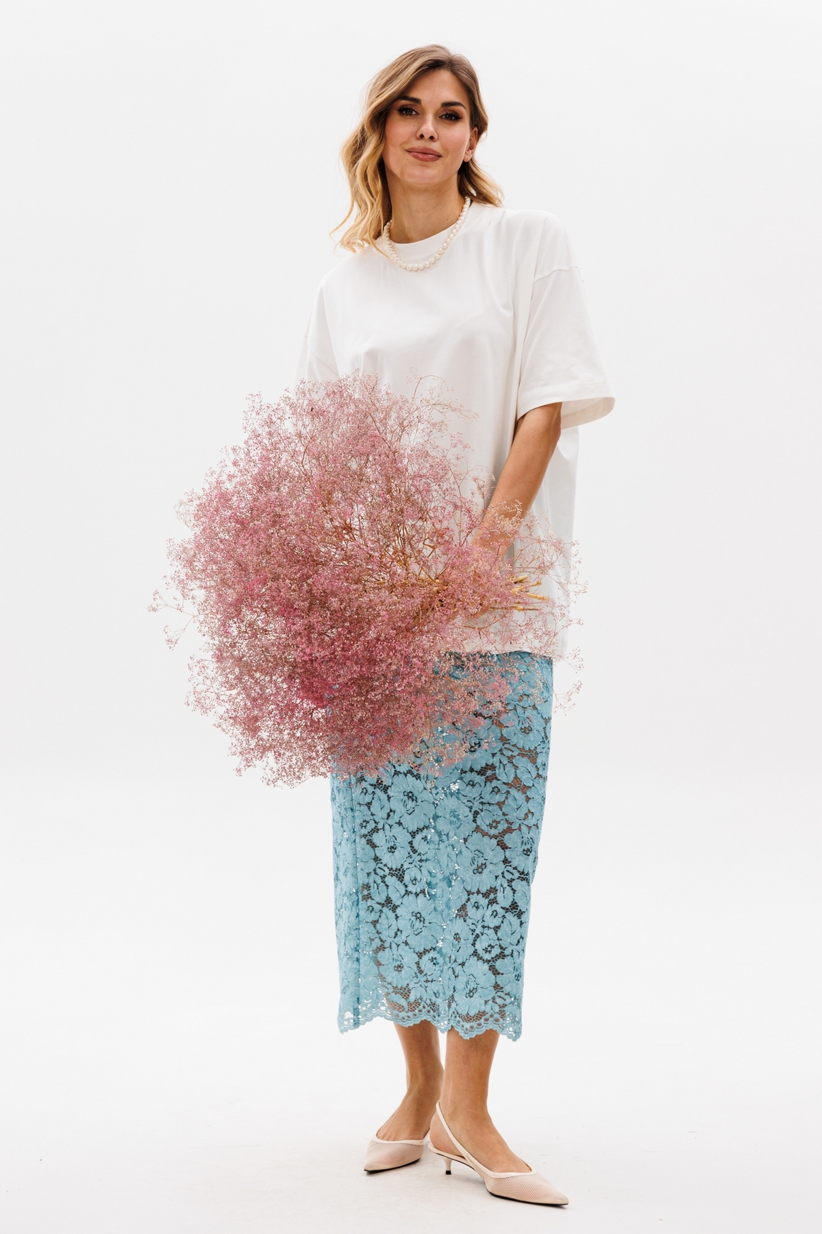 Джемпер выполнен из трикотажного полотна, прямого покроя, длиной до линии бедер. Перед и спинка цельные. Горловина округлой формы. Плечевой шов спущен. Рукав одношовный, длиной до линии локтя. Перед декорирован принтом.