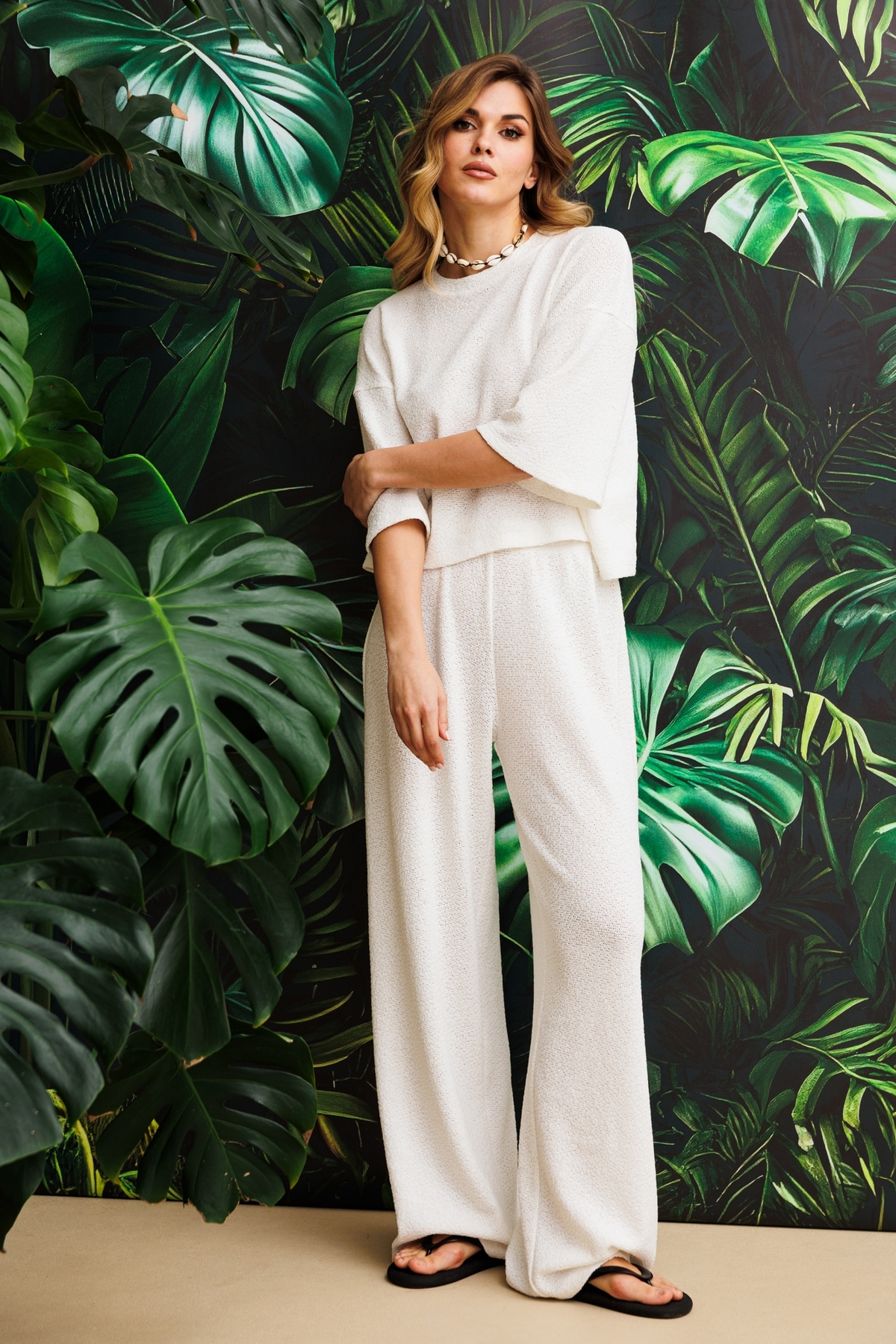 Джемпер выполнен из трикотажного полотна. Джемпер прямого покроя, длиной ниже линии талии, покроя oversize. Перед и спинка цельные. Горловина округлой формы, обработана бейкой. Плечевой шов удлинен. Рукав рубашечного покроя, одношовный, длиной до линии локтя.
