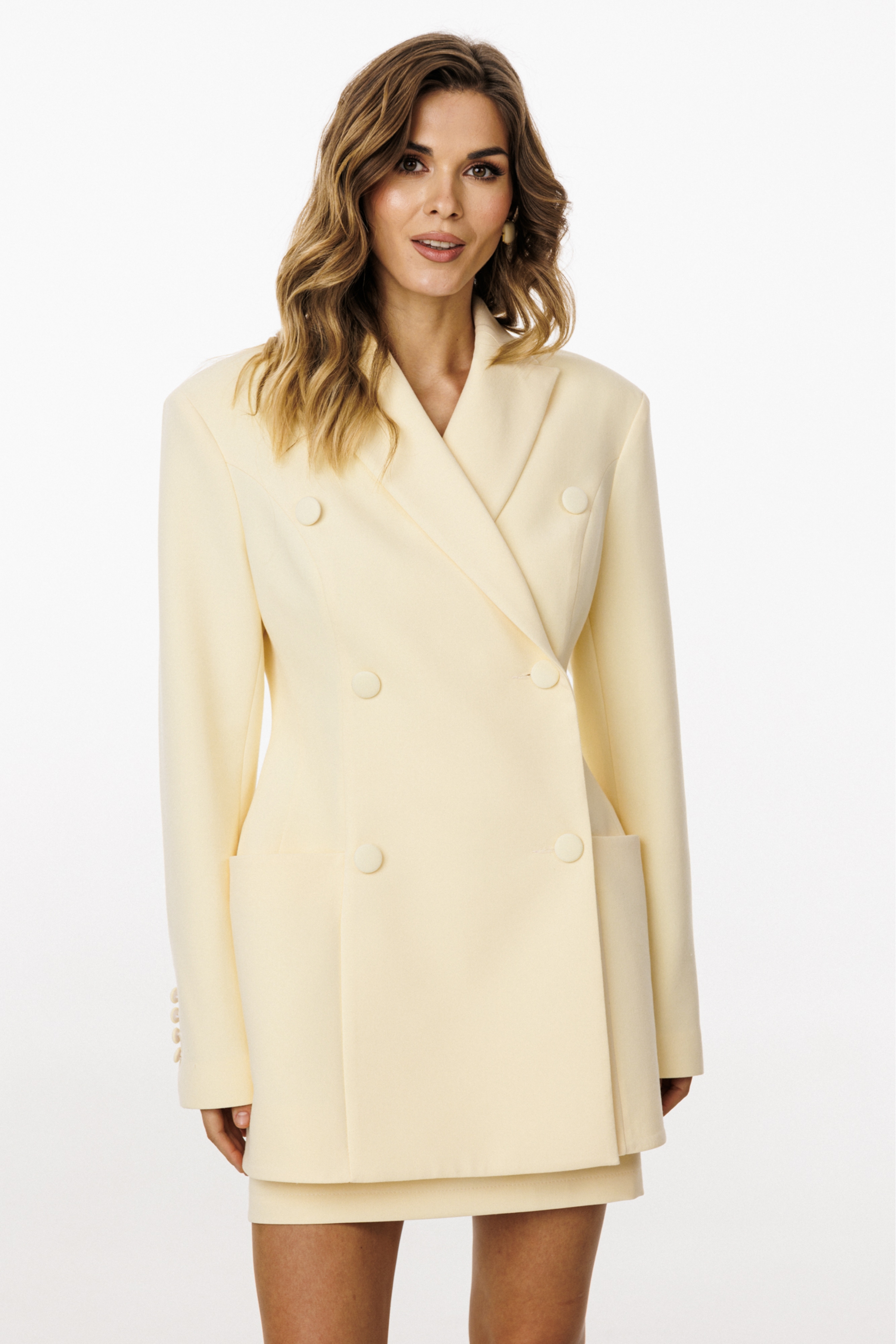 Жакет выполнен из костюмной ткани. Жакет К-образного силуэта, длиной ниже линии бедер. По переду обработаны рельефы от проймы до низа, талиевые вытачки, горизонтальные подрезы, переходящие на спинку, в которых обработаны карманы и лацканы. На спинке обработаны две пары рельефов от проймы до низа и средний шов. Воротник пиджачного типа. Жакет с плечевыми накладками, плечевой шов удлинен. Рукав втачной, двухшовный. По низу рукав обработан шлицей, застёгивающеюся на 4 петли и пуговицы. Жакет двубортный, на притачной по низу подкладке.