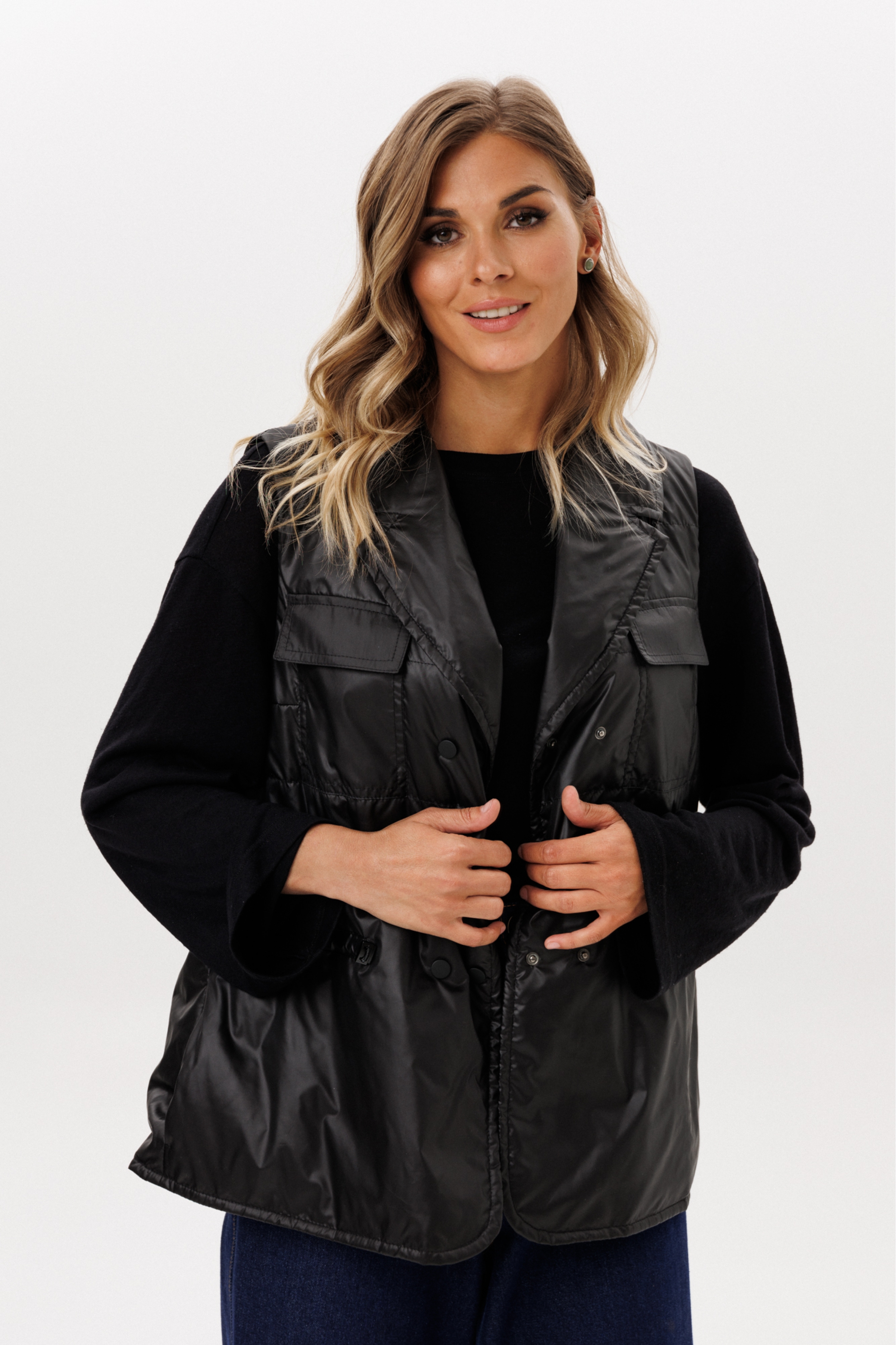 Жилет выполнен из плащевой ткани с утеплителем Isosoft. Жилет полуприлегающего силуэта, длиной до линии бедер. Застежка спереди центральная двубортная на пробивные кнопки. Спереди лацканы, накладные нагрудные карманы с клапанами и боковые карманы в швах. Спинка цельная. Воротник пиджачного типа. По линии талии настрочена кулиса, в которой протянута эластичная тесьма с фиксаторами. Жилетка на подкладке из основной ткани.