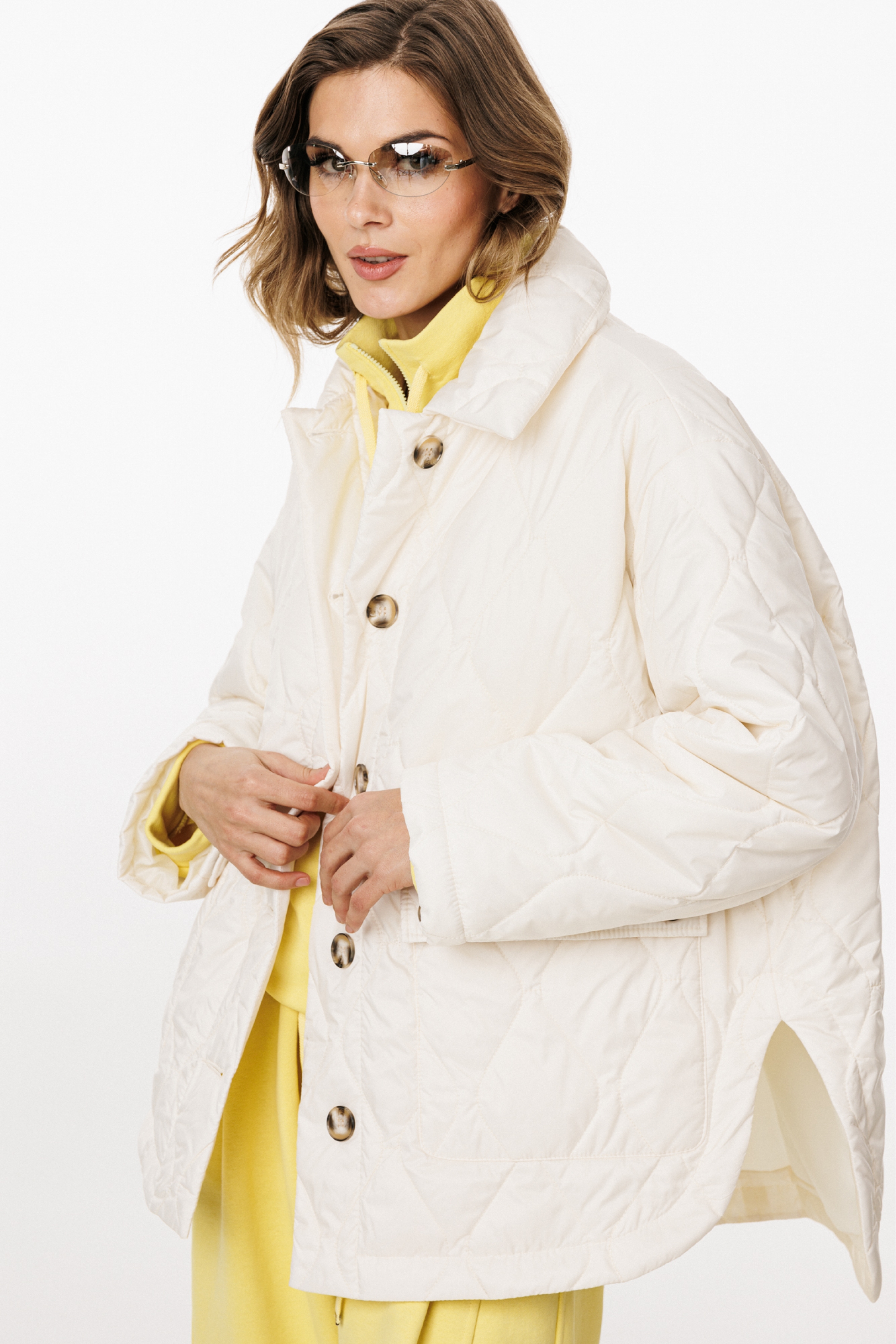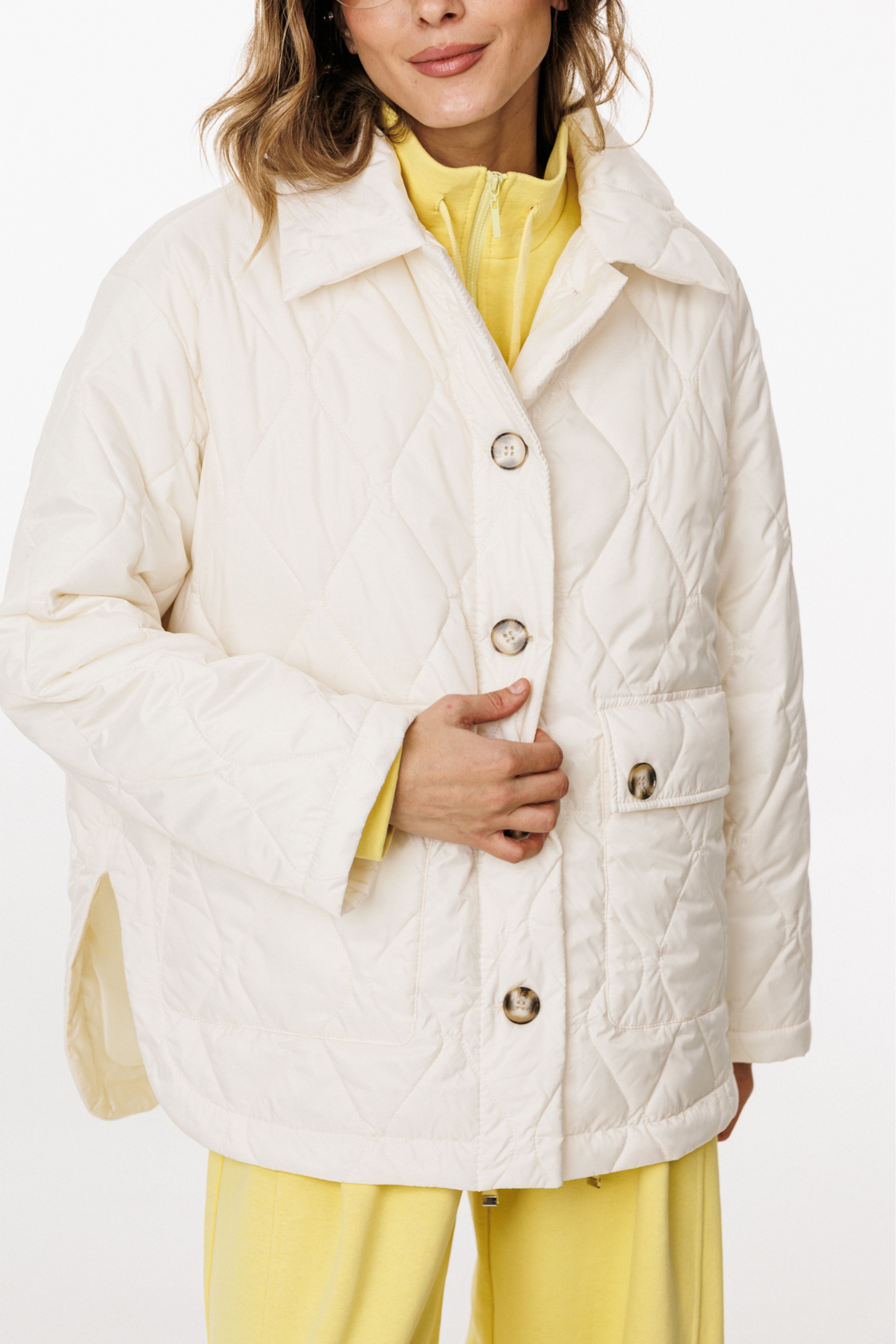 Куртка выполнена из плащевой ткани, простеганной с Isosoft. Куртка прямого силуэта, длиной до линии бедер. Застежка центральная бортовая на пришивные пуговицы. Спереди накладные карманы с клапанами. Спинка цельная. Воротник стояче-отложной. Рукав втачной, двухшовный. Плечевой шов спущен. Пройма углублена. Спинка длиннее переда. В боковых швах фигурные разрезы.