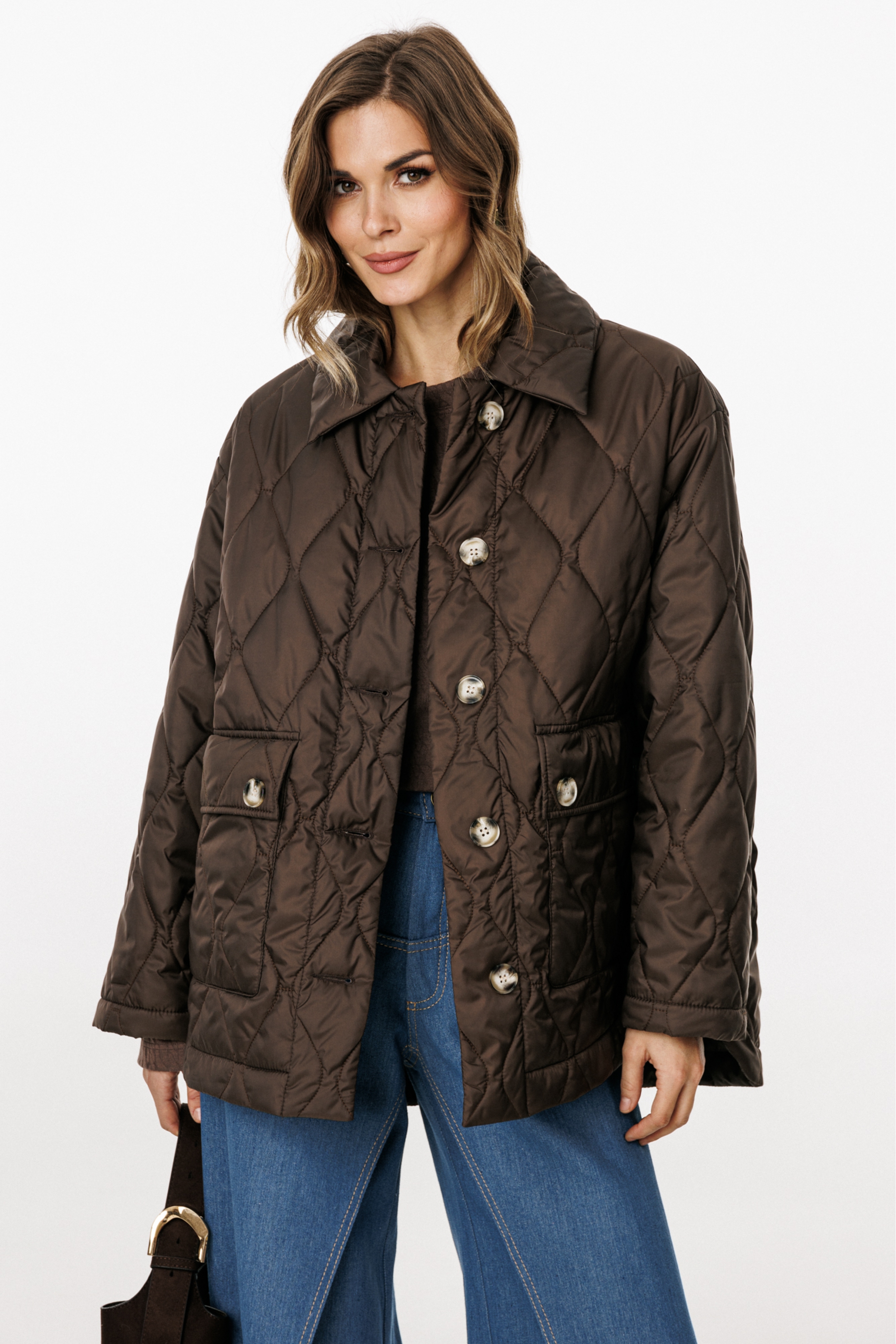 Куртка выполнена из плащевой ткани, простеганной с Isosoft. Куртка прямого силуэта, длиной до линии бедер. Застежка центральная бортовая на пришивные пуговицы. Спереди накладные карманы с клапанами. Спинка цельная. Воротник стояче-отложной. Рукав втачной, двухшовный. Плечевой шов спущен. Пройма углублена. Спинка длиннее переда. В боковых швах фигурные разрезы.